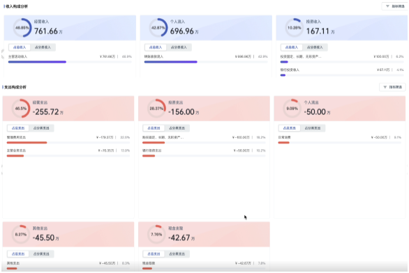 顺利获得从流水总规模、流水分类、流水分布等分析申贷主体的流水情况。以经营活动、投资活动、筹资活动三个维度逐条还原分析流水交易实质
